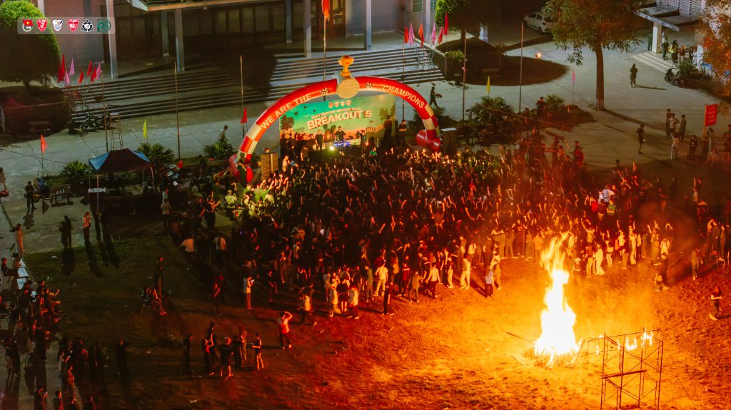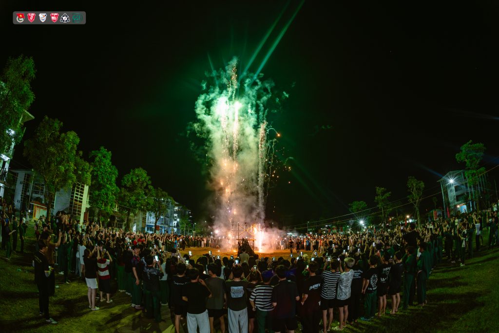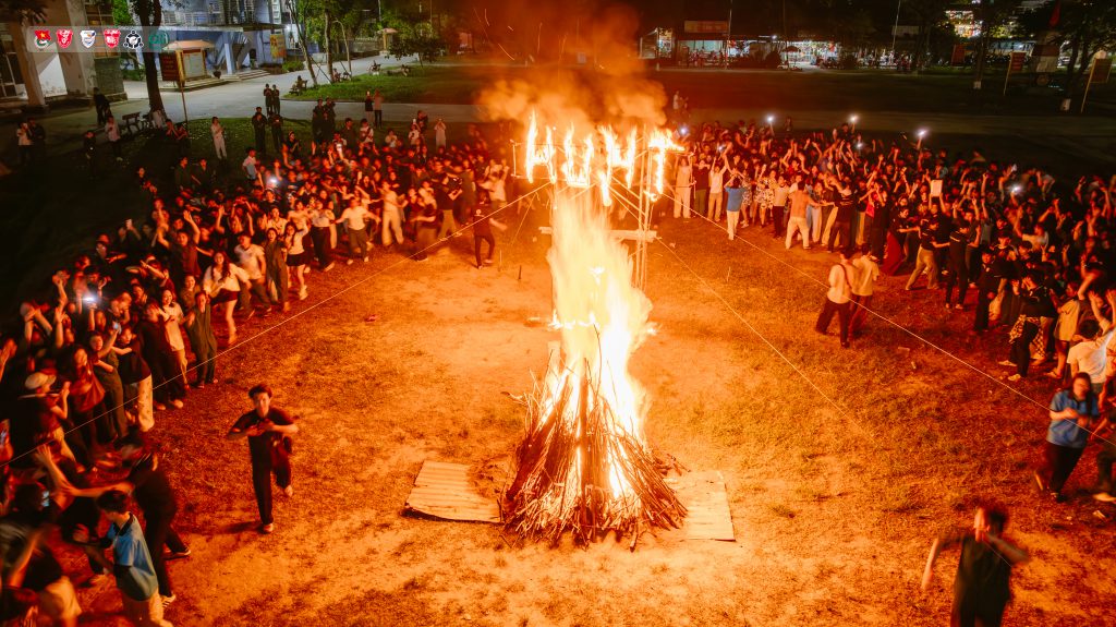 Phần thắp đuốc được thực hiện trong không khí trang nghiêm, xúc động. Đại diện Ban Chấp hành Đoàn trường đọc “Lời gọi lửa”, nhấn mạnh tinh thần đoàn kết, niềm tự hào dân tộc và trách nhiệm của tuổi trẻ trong thời kỳ mới. Ngọn lửa trại bùng lên giữa sân khấu, hòa cùng điệu nhảy tập thể đã thắp sáng tình bạn, tình đồng chí của những người con đất Việt.